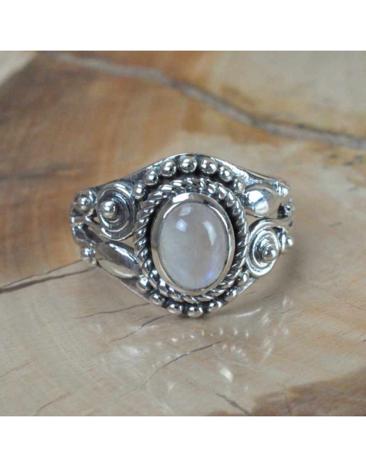 -Bague en argent 925 ornée d ' une pierre de lune et finement décorée aux motifs indien .