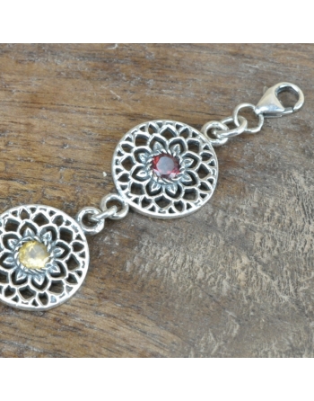 -Bracelet composé de 7 pierres différentes au centre d ' un mandala, mousqueton en fermeture, chainette de sécurité avec un petit arbre de vie .